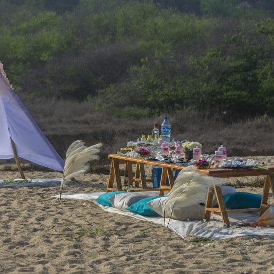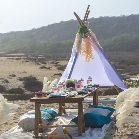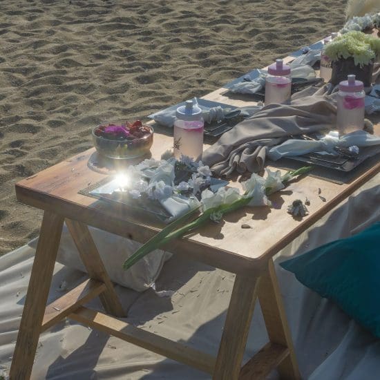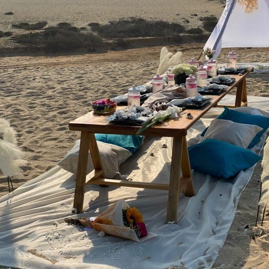 - Table decorated with every detail: tablecloths, plates, cutlery, cloth napkin, flowers, floor fabrics and pillows, decorative lights, and welcome details.