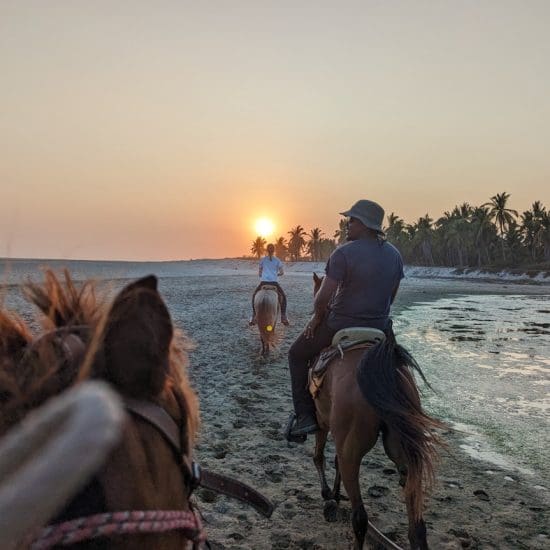 Nos tours sont soigneusement conçus pour vous offrir un véritable coin de paradis depuis le dos d’un cheval. Avec nous, vous ferez plus que simplement monter à cheval – vous connecterez avec la nature, la culture, et l’excitation de la découverte. Alors que le soleil commence à se coucher sous l’horizon, il n’y a pas de meilleur endroit que sur le dos d’un cheval, galopant le long des rives sablonneuses de la plage de Puerto Suelo. Notre balade au coucher de soleil sur la plage est un favori des fans, vous offrant une place au premier rang pour le coucher de soleil le plus magique de Puerto Escondido. Sentez la brise, écoutez les vagues et laissez-vous emporter par le moment.