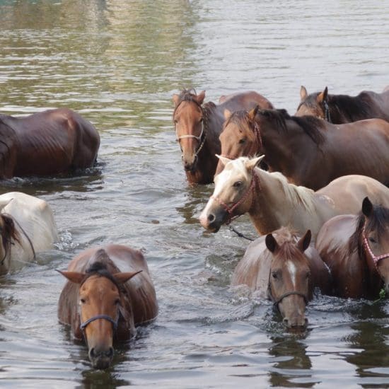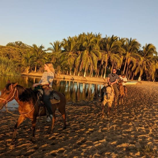 Après avoir traversé la deuxième rivière, vous profiterez d’une autre balade de 10 minutes jusqu’à ce que vous atteigniez une petite branche de la lagune de Manialtepec. À cet endroit, vous pourriez avoir l’occasion de voir de petits crocodiles, car beaucoup d’entre eux vivent dans les mangroves à proximité. Nos guides vous aideront à descendre de vos chevaux pour embarquer dans un petit bateau et traverser la lagune. Une fois de l’autre côté, vous assisterez à un spectacle incroyable de chevaux nageant dans la lagune jusqu’à ce qu’ils vous rejoignent sur le côté de la plage !